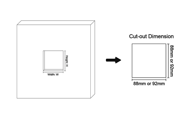Installation Panel montiert Abmessung (L * W * H) Platten größe (L × W): 96*96mm Ausschnitt (L × W): 92*92mm Gehäuse (L × B × H): 90*90*77,8mm Relais DC 30V/3A AC 220V/3A Verbrauch 0,2% |